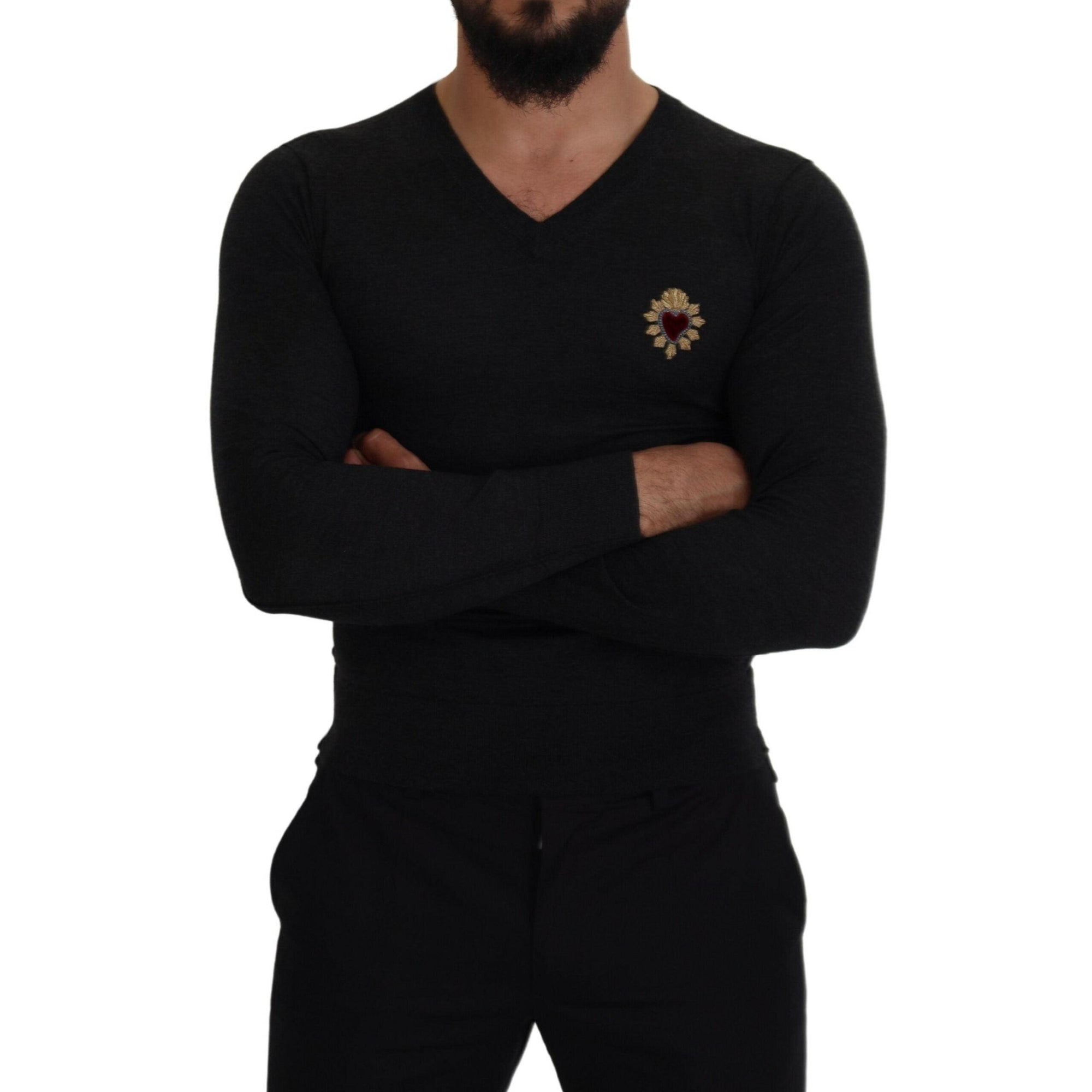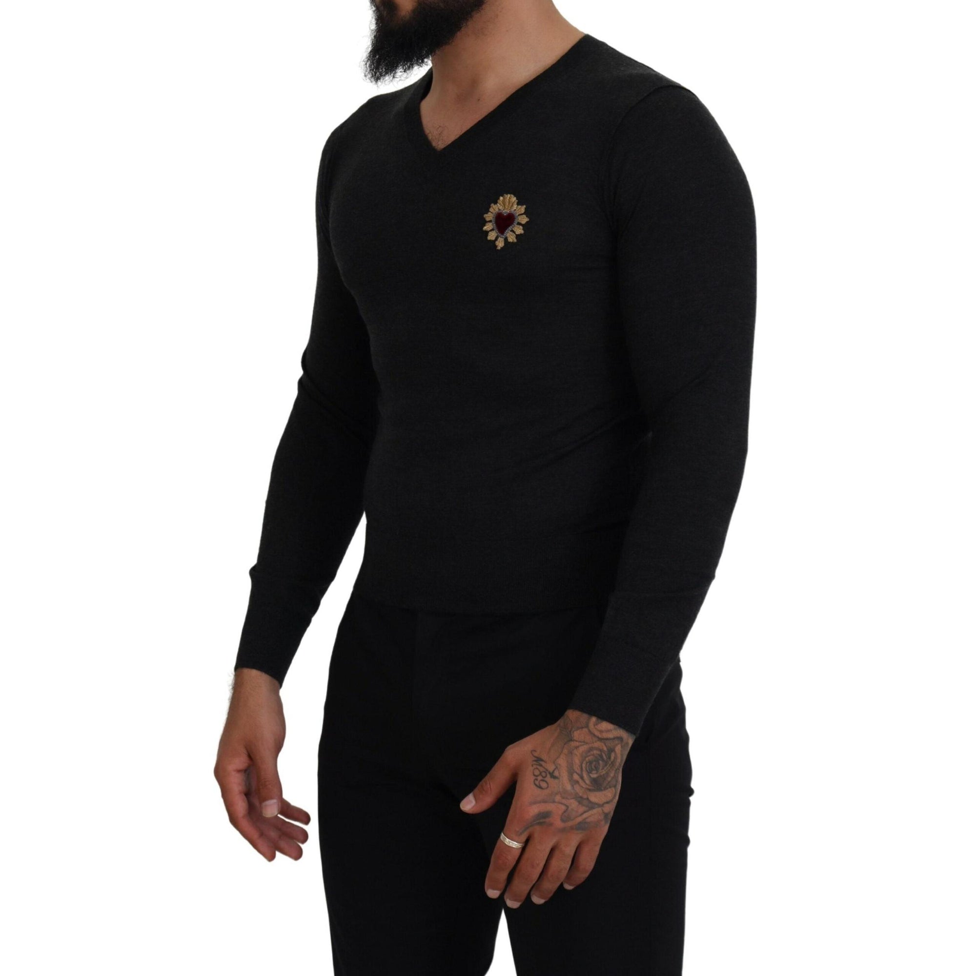Dolce & Gabbana V-Neck Cashmere Sweater with Heart Embroidery