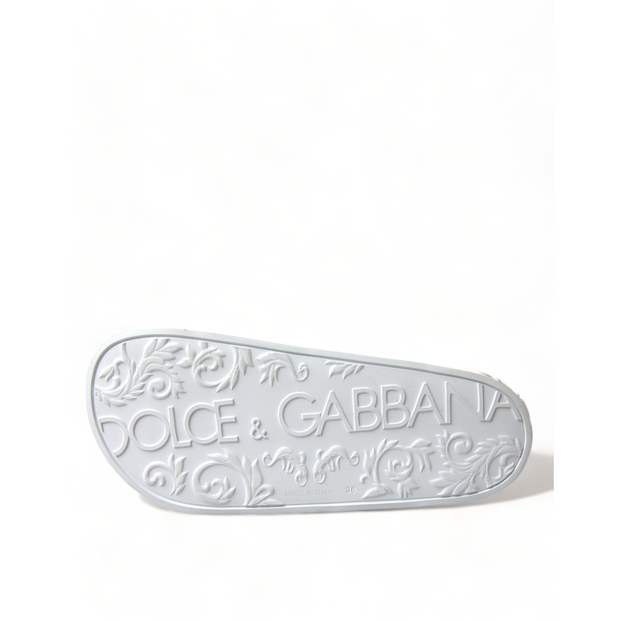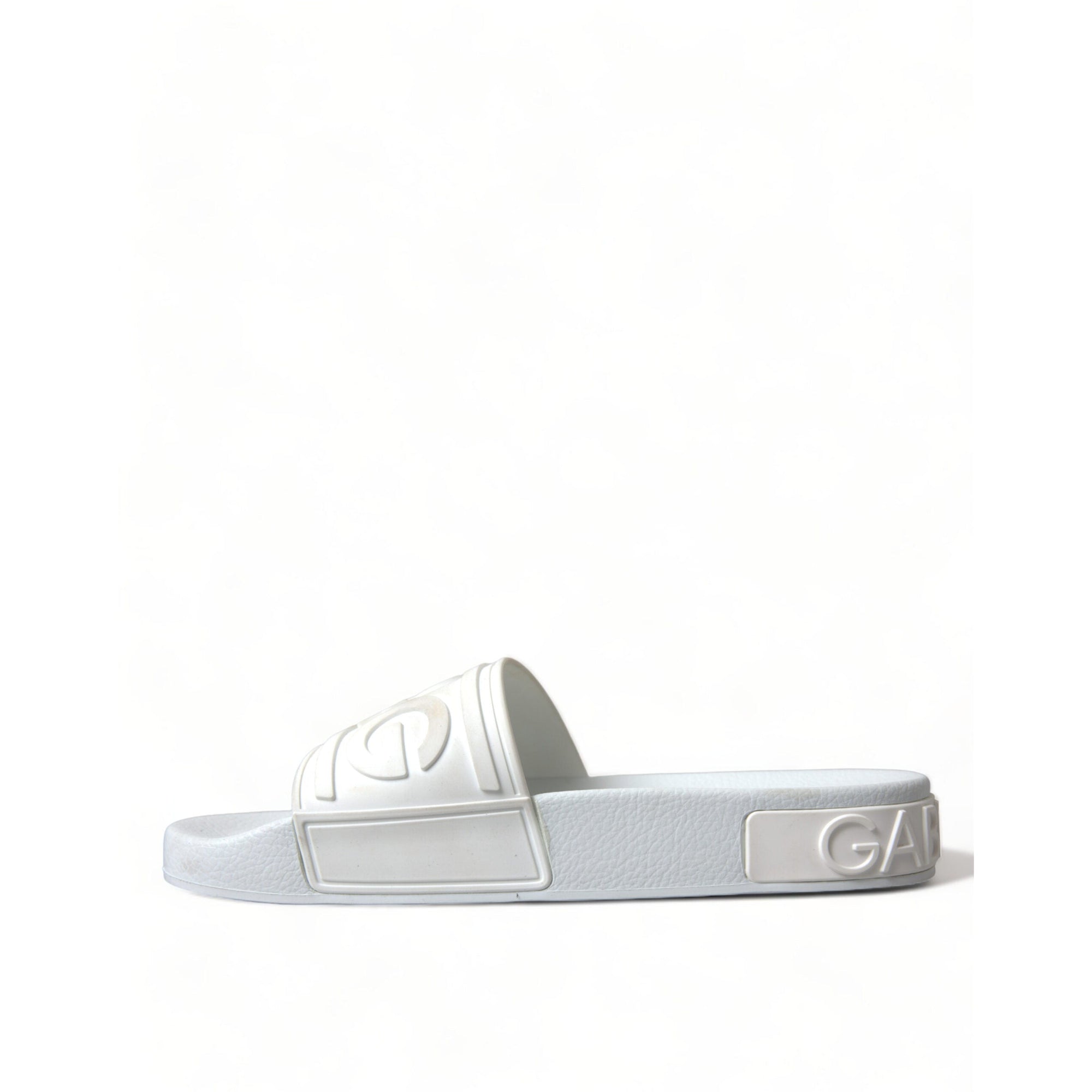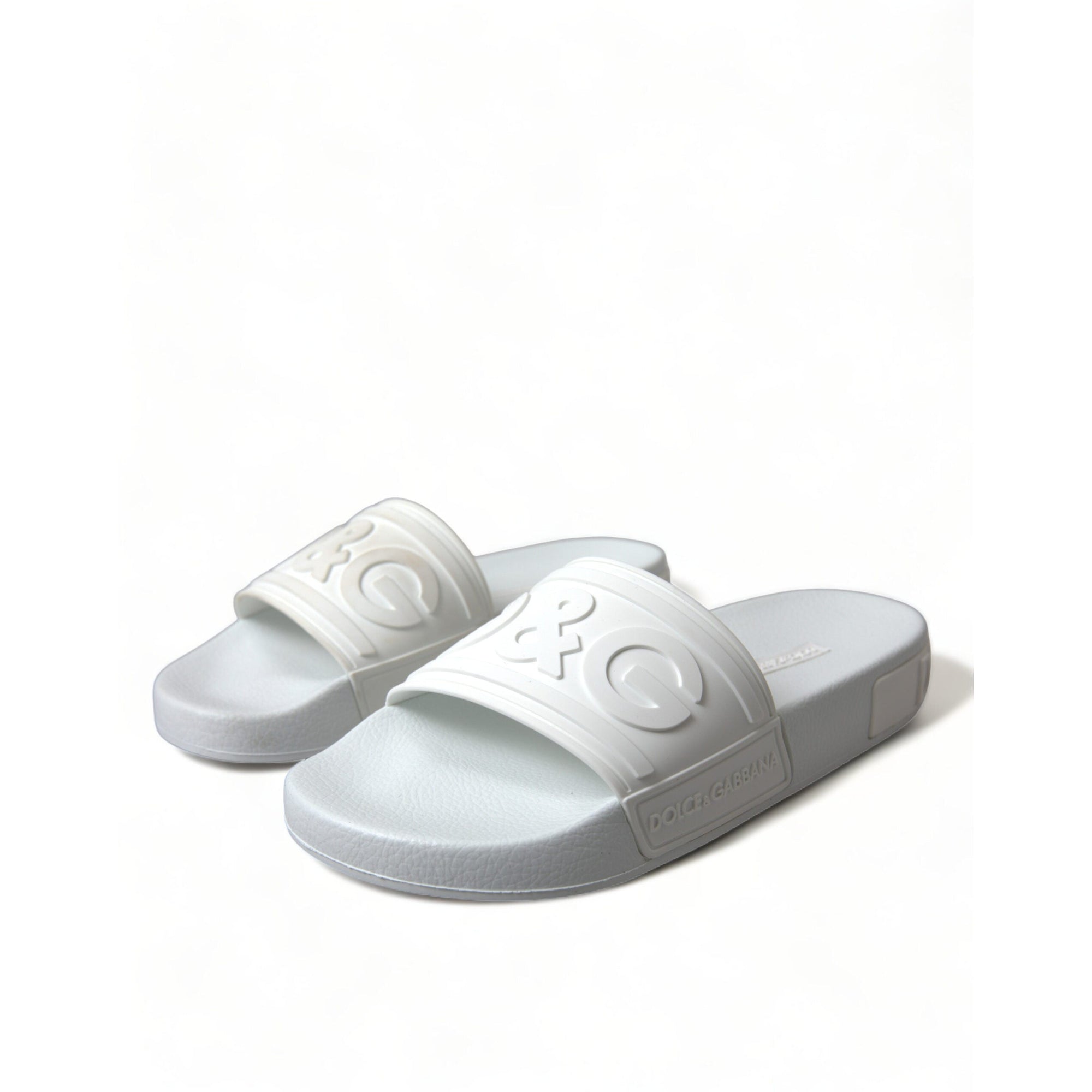 Step into luxury with these exquisite white logo embossed slides from the renowned house of Dolce & Gabbana. Impeccably crafted in Italy, these slides are perfect for those who seek elegance even in their casual wear. The wide strap design and molded footbed provide both supreme comfort and style, making these flats a summer essential for any fashion-forward wardrobe.